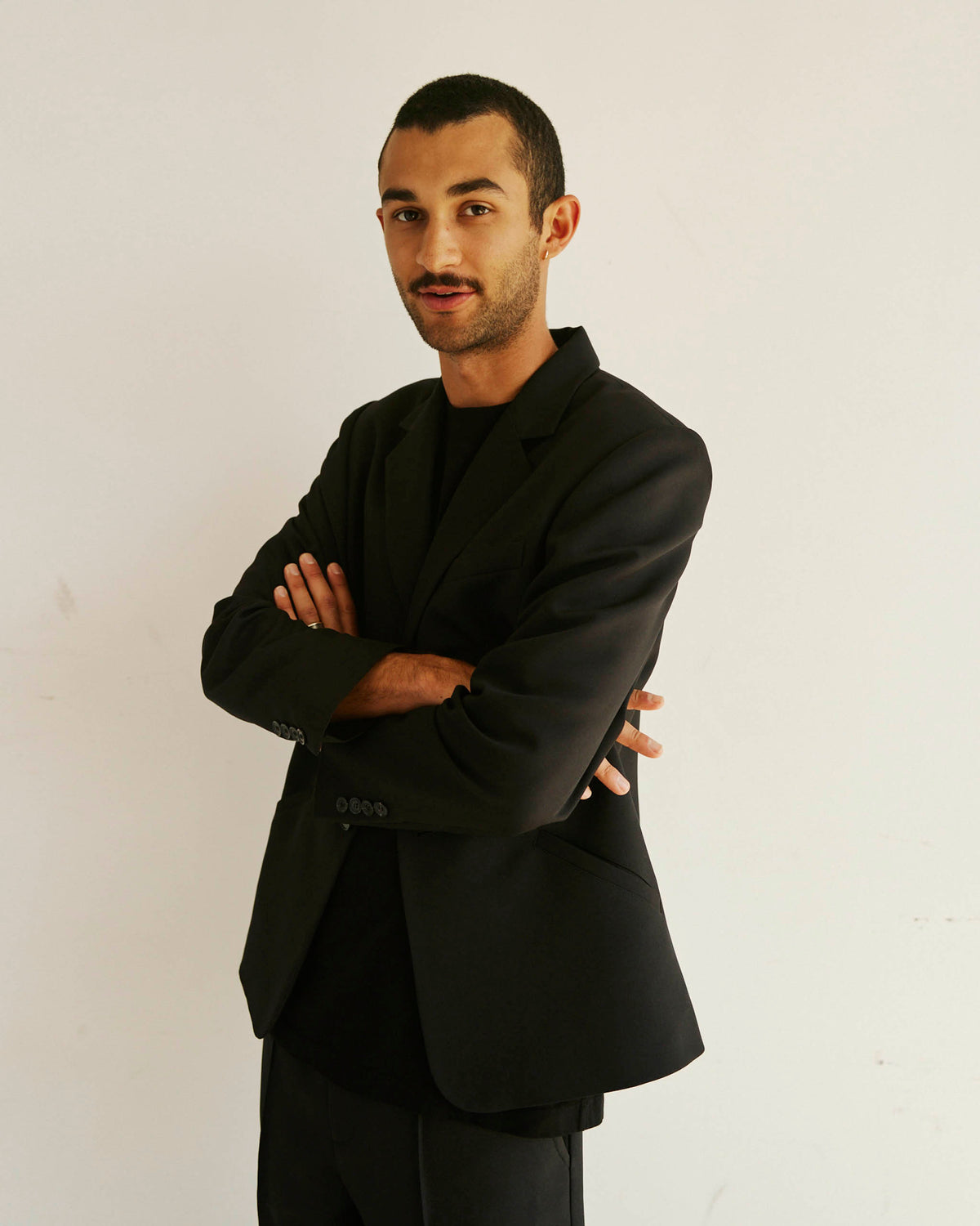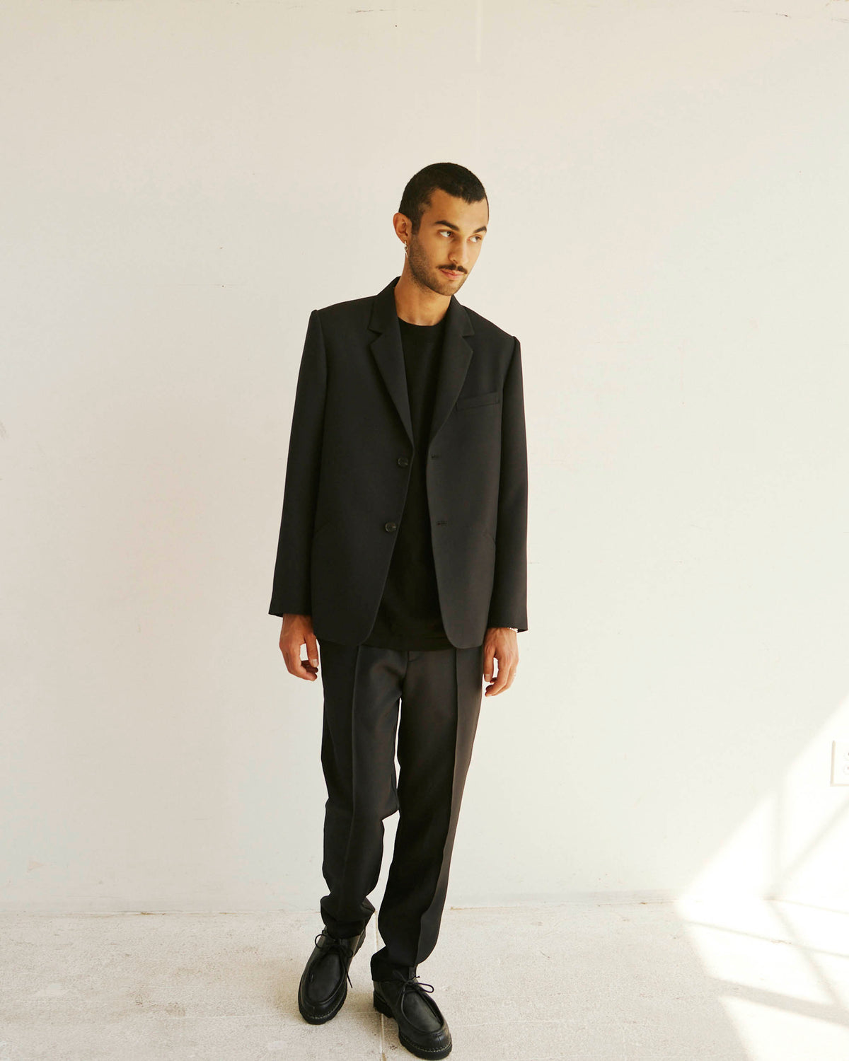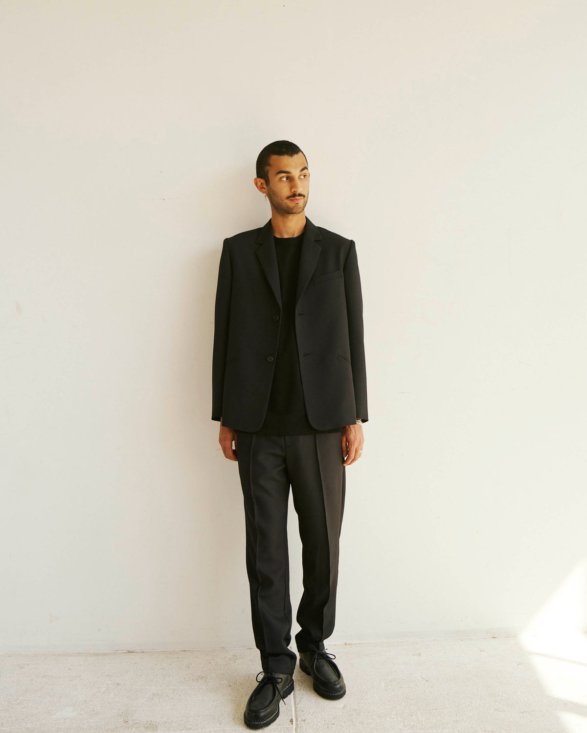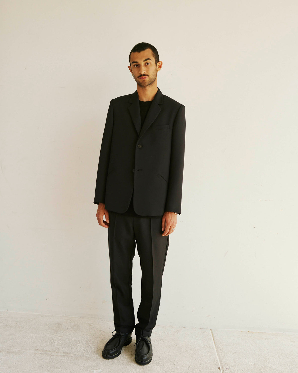 Brice wears the single breasted Alden Blazer with the Sleeve Logo House Tee and Permapress Trousers.
