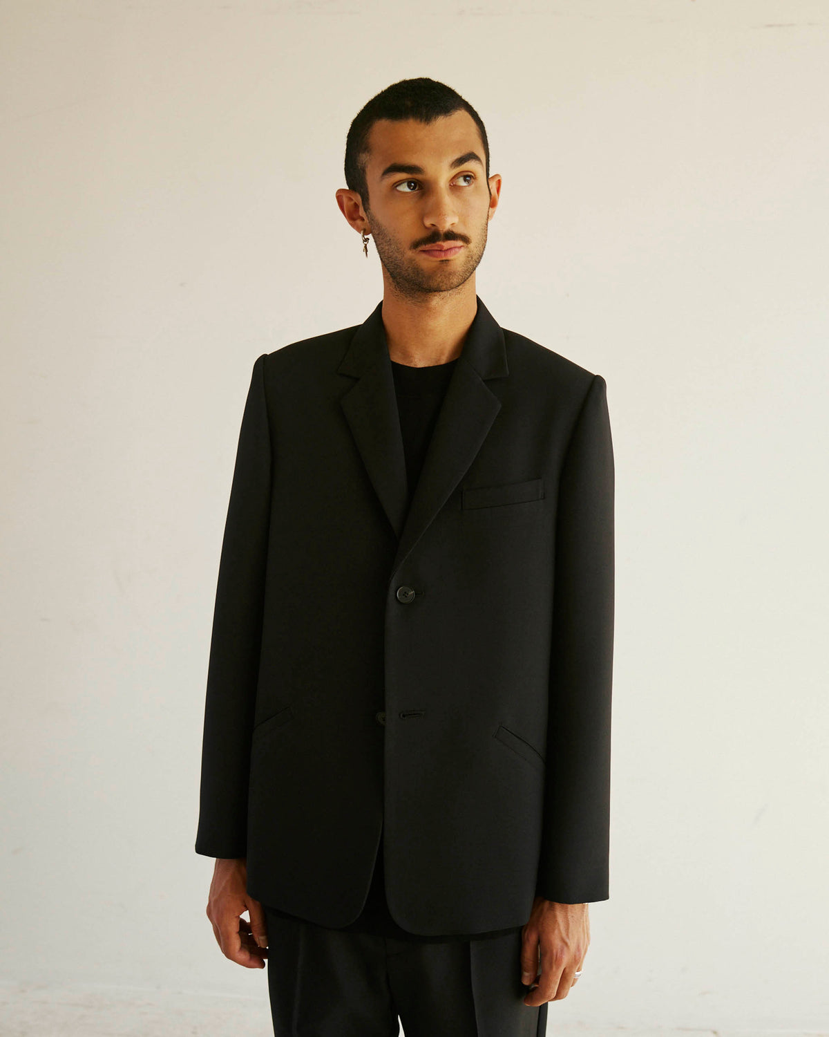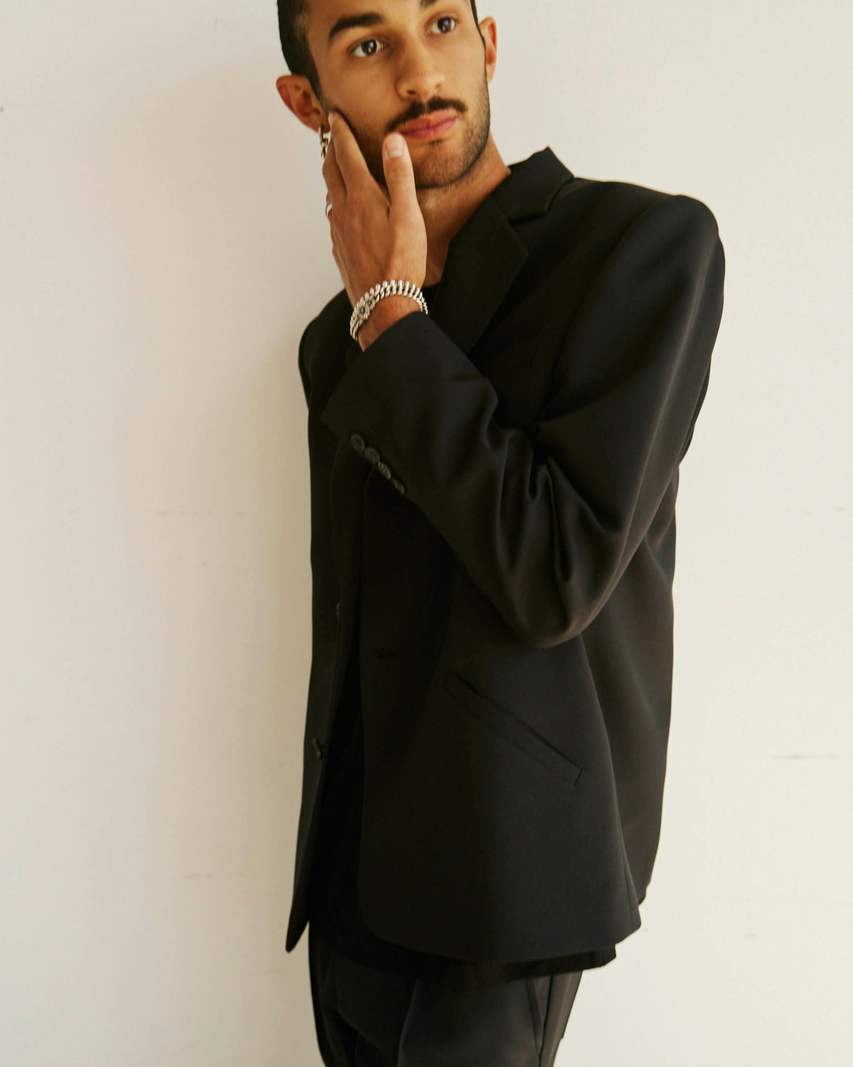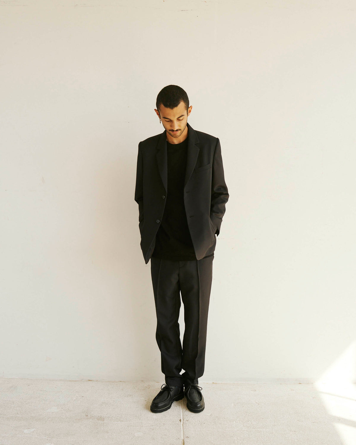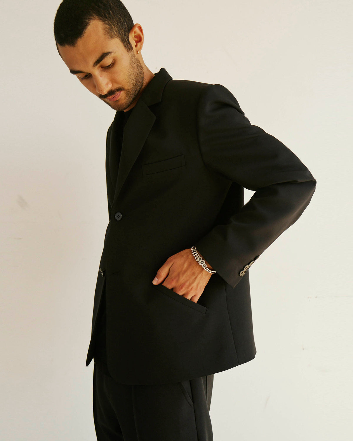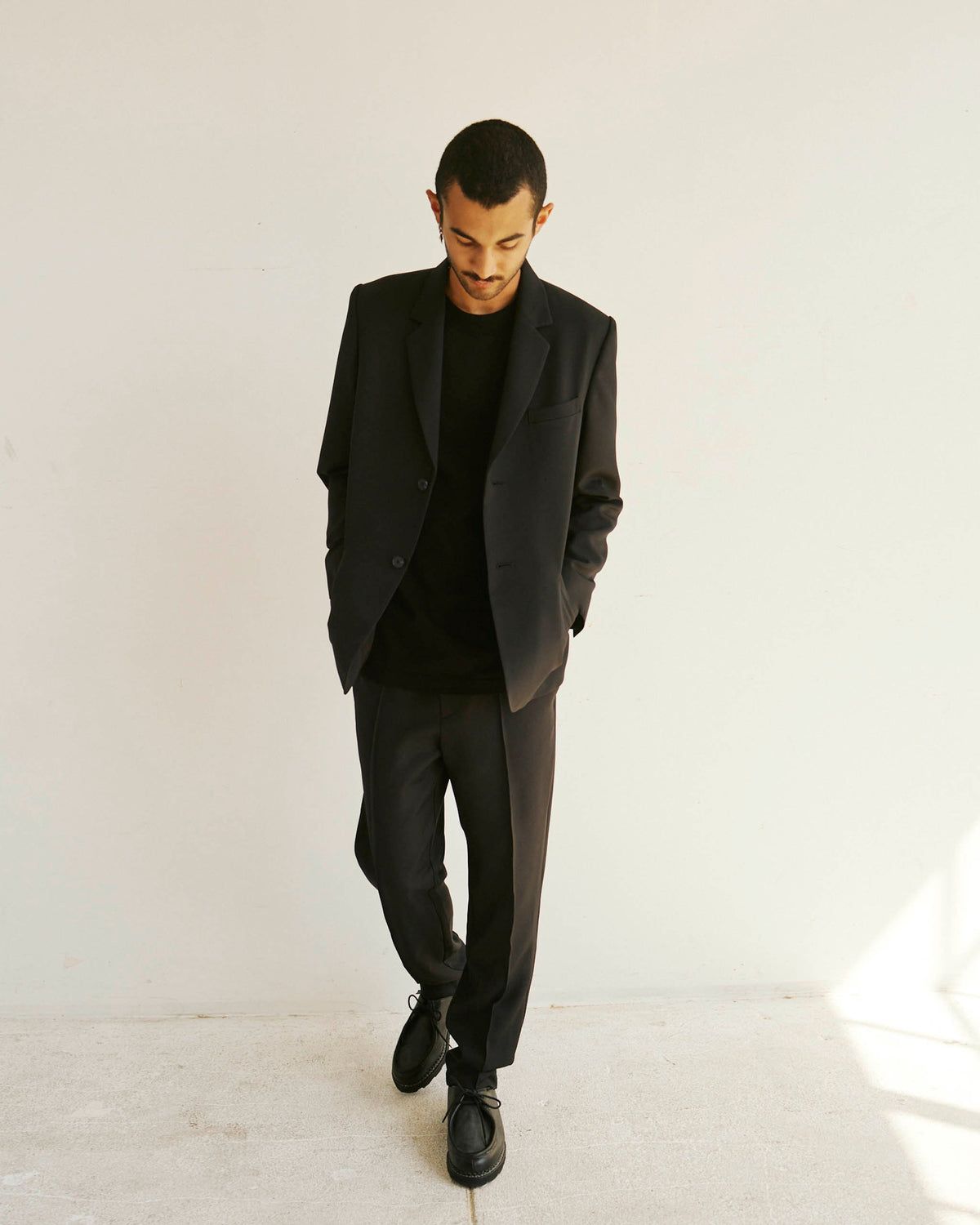 Brice wears the single breasted Alden Blazer with the Sleeve Logo House Tee and Permapress Trousers.