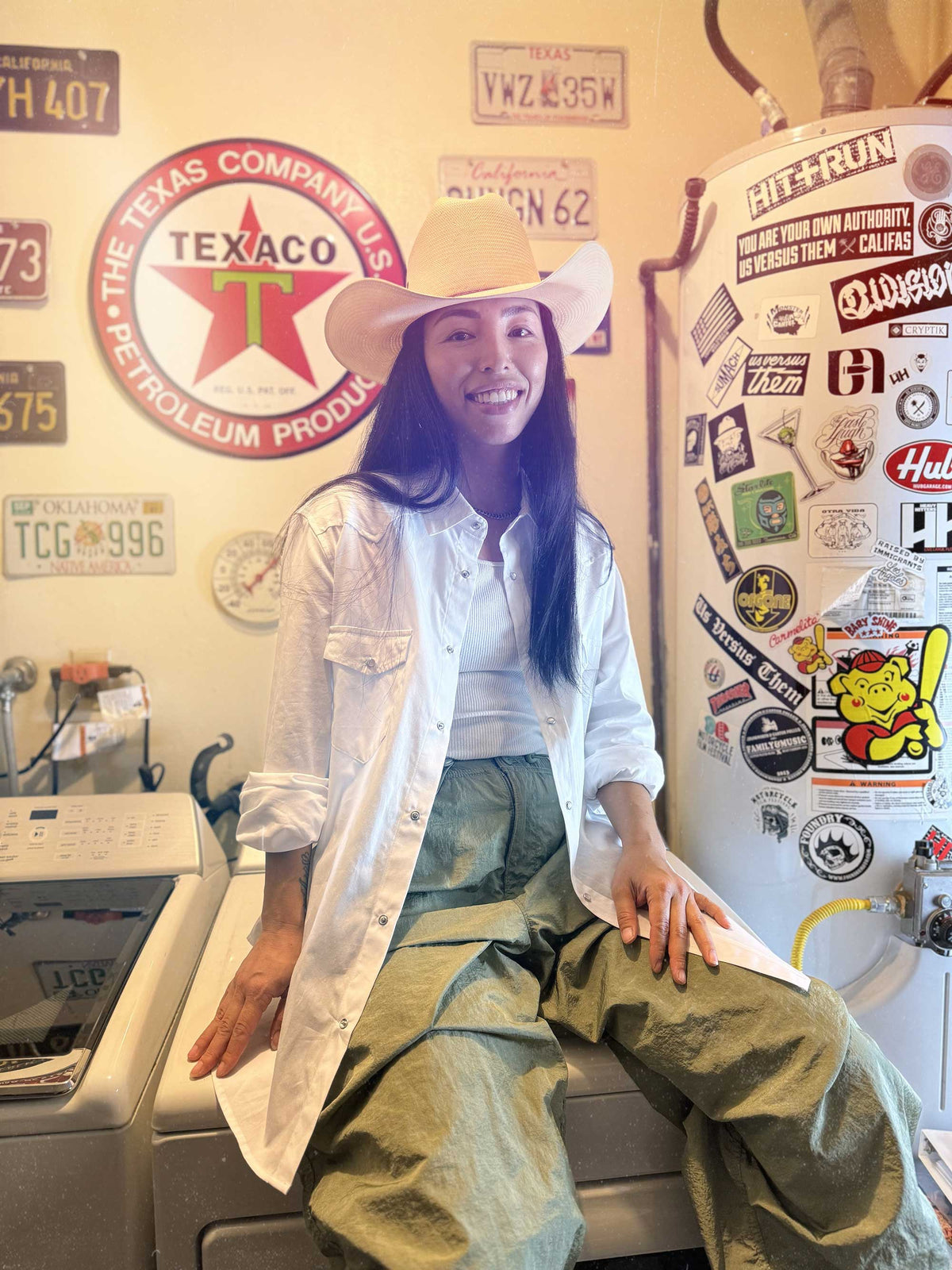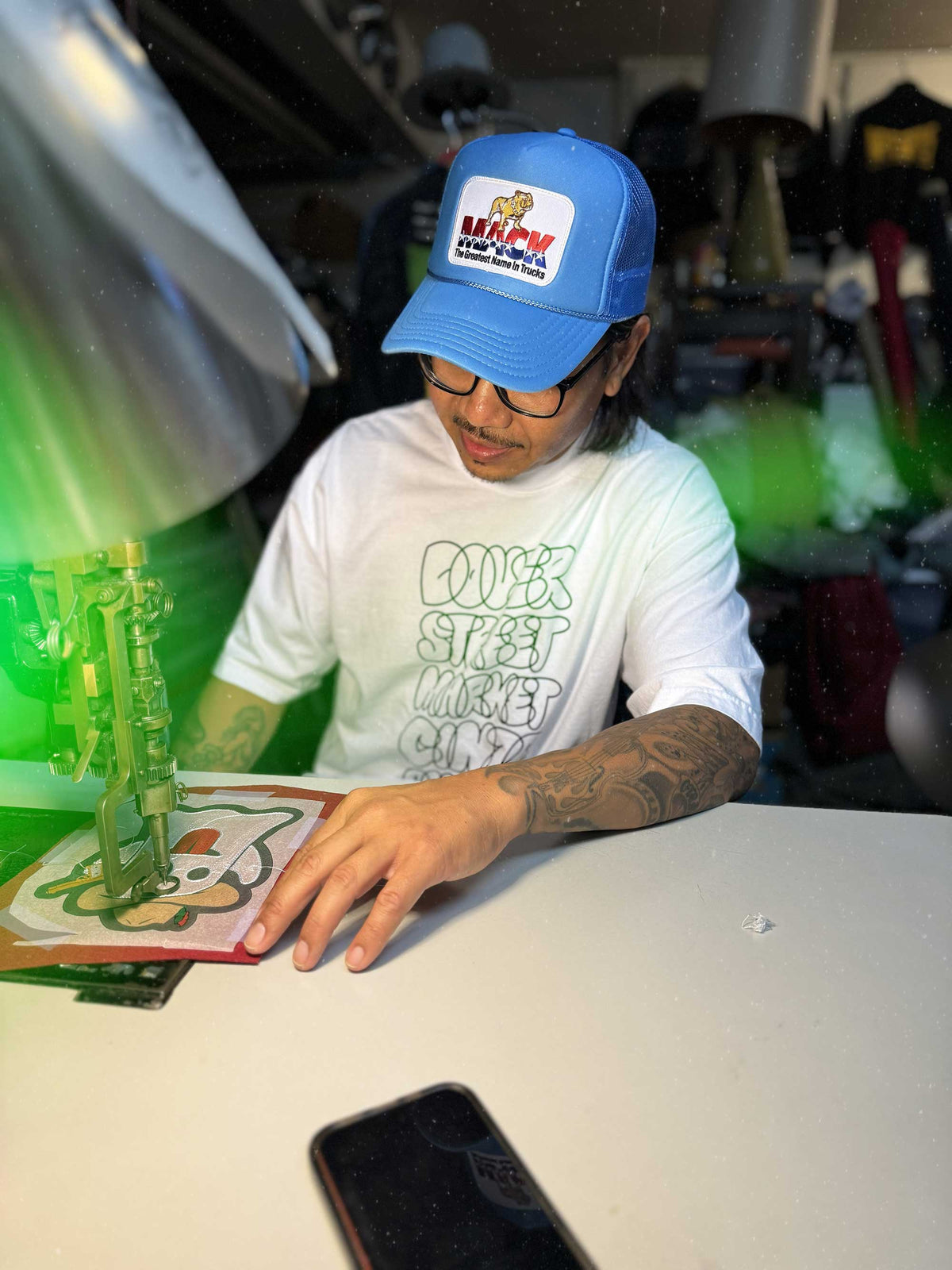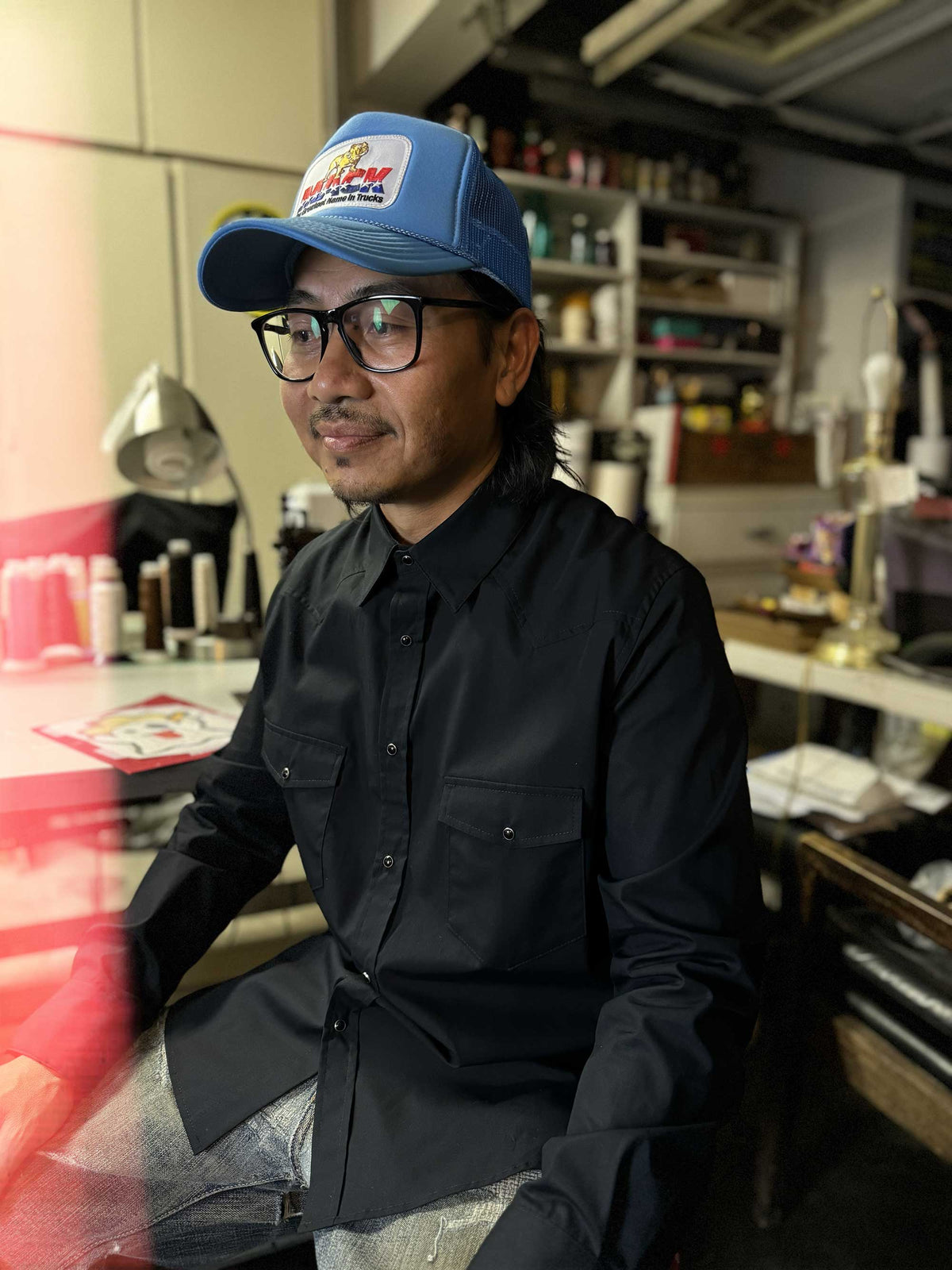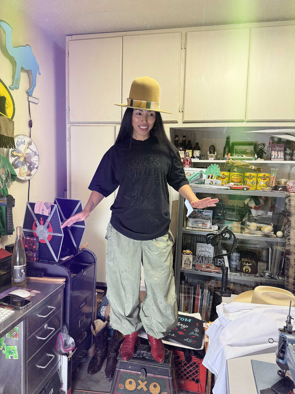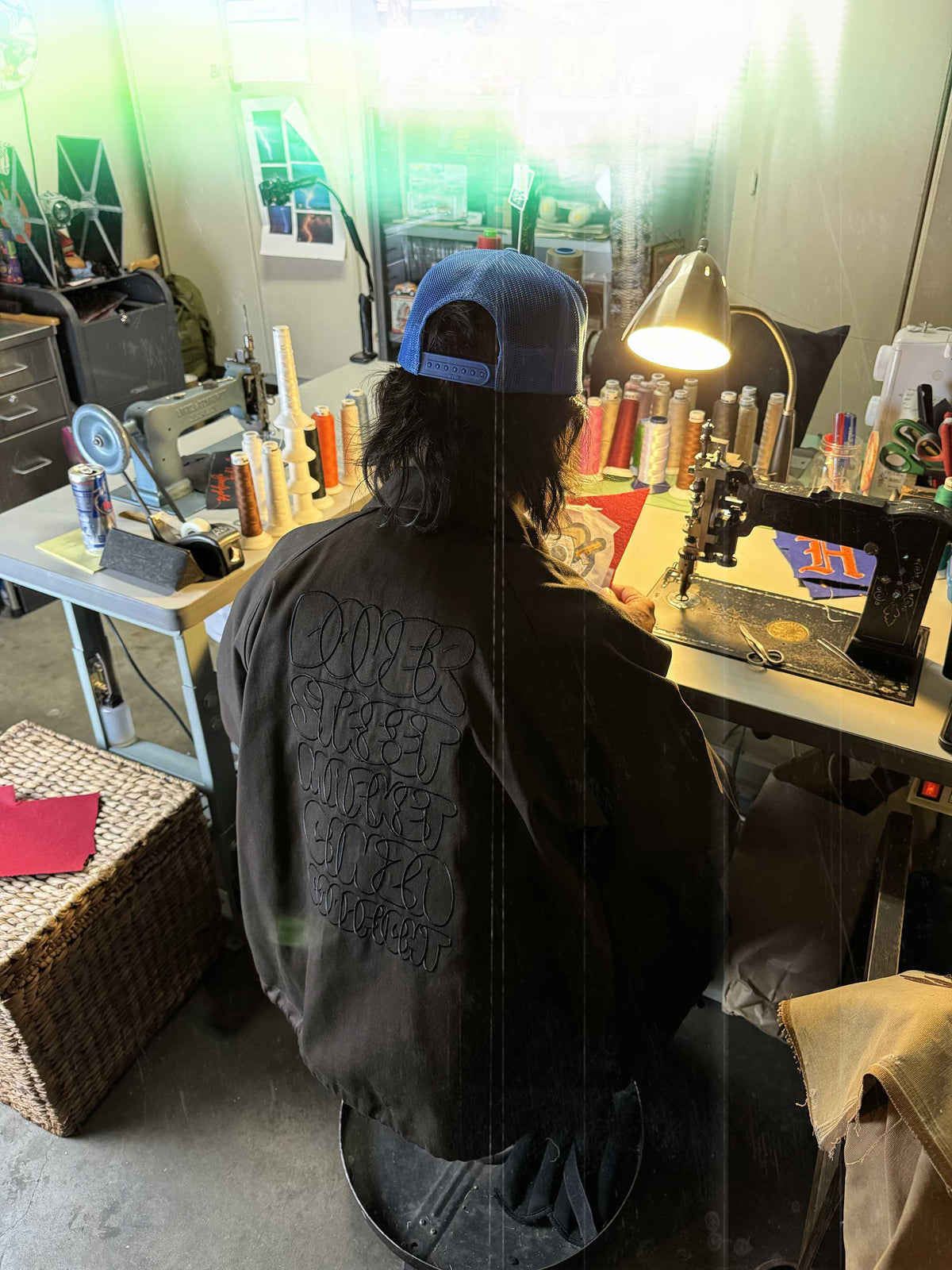 “Ghost Town” was created in collaboration with Dover Street Market Ginza for their annual Open House event, which is their biggest day of the year. The capsule centered around a “spooky” Halloween motif, with Goodfight coming to Japan as an American brand in the same way the holiday has become part of celebration in Tokyo. Instead of traditional “spooky” font, designer Calvin Nguyen opted for a graffiti style font he created himself. Again, drawing on the “western” element of the brand, Goodfight created a new western shirt, cut in Italian broadcloth and furnished with tonal pearl snaps, perfect for wearing casually or even layered underneath a blazer. In the same vein, our signature Coaches Jacket was cut in an Made in USA chino twill so that it will break in, change, and age beautifully with wear; the back features the collaboration artwork in beautiful embroidery.