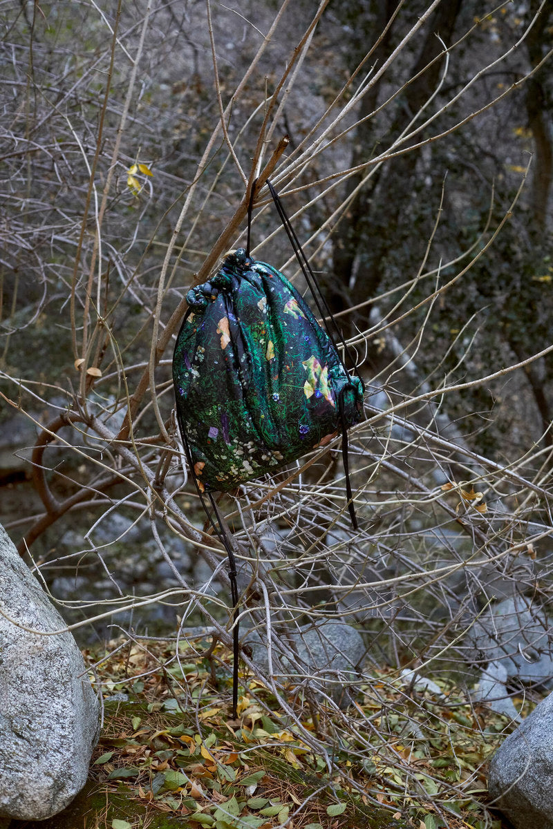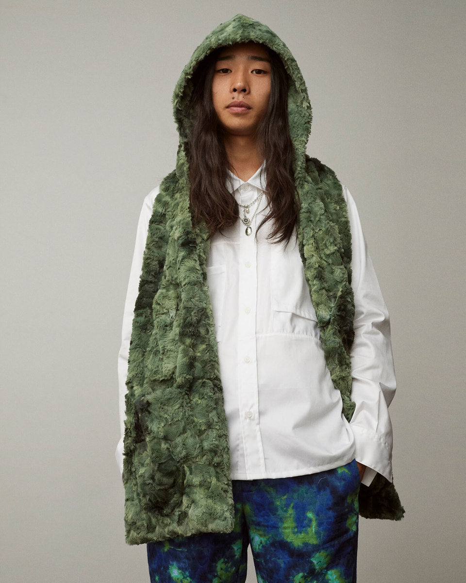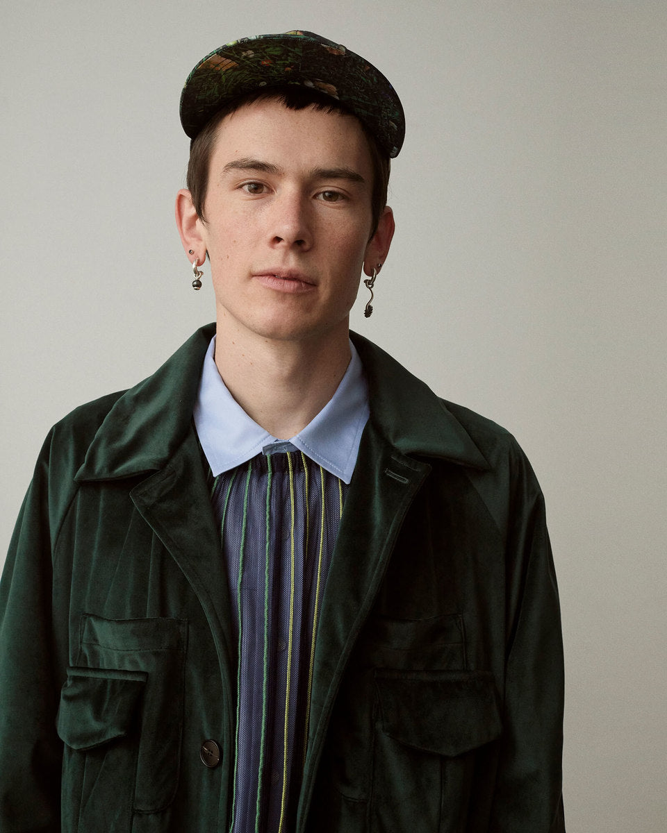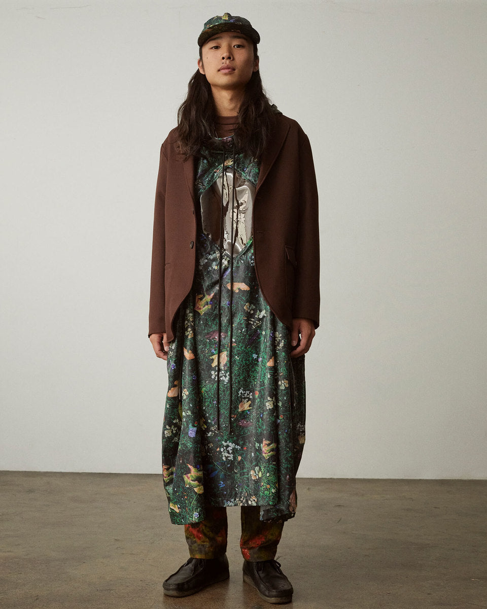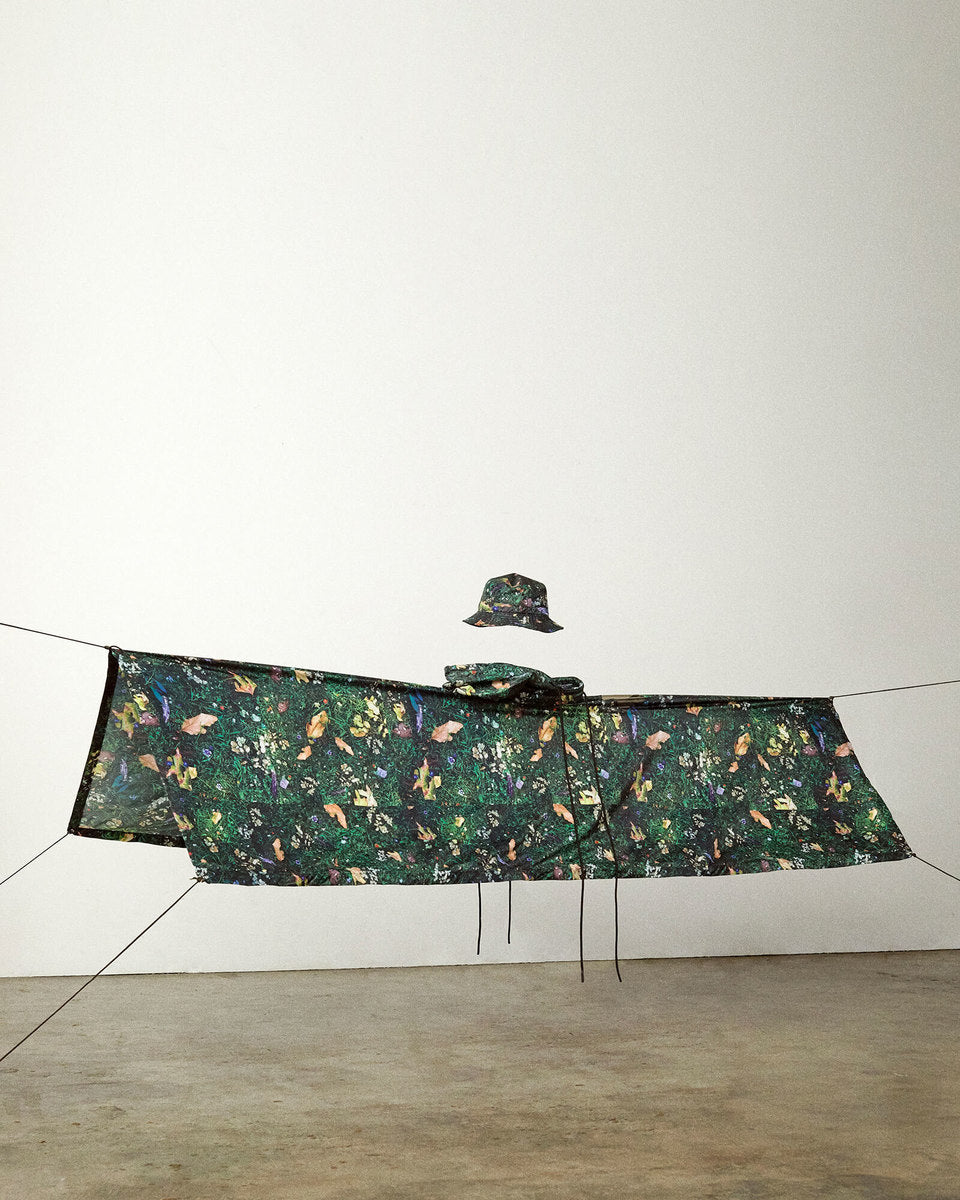 The FW20 collection “Harvest Train To Christmas Mountain, I Know We’ll Be There Soon” follows a 9-to-5 office employee trapped in the hamster wheel of his corporate life. Desperate for some kind of escape, he discovers psilocybin fungi and plans a new life in the outdoors. It’s immediately apparent that the skills he’s used to succeed in his occupation mean nothing in the wild—he’ll need to develop his own kind of bushcraft skills if he’s going to survive.