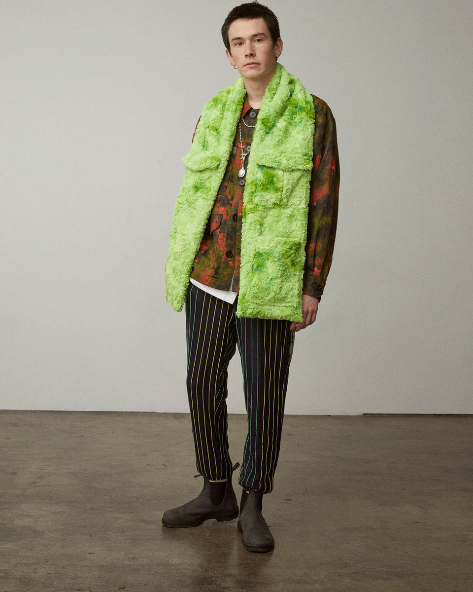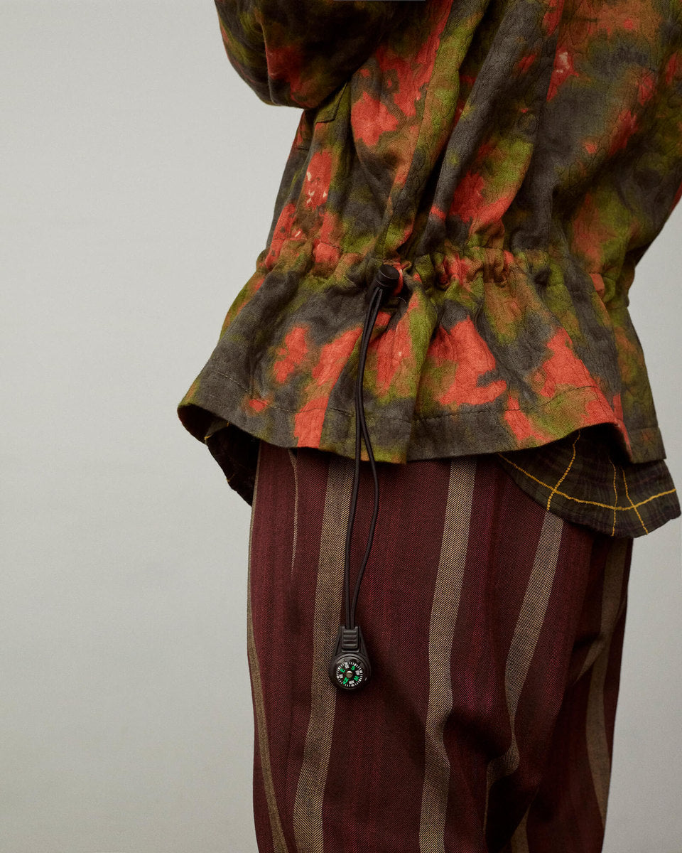 Powder blue “office-attire” buttondowns have distorted dimensions; everyday garments have been repaired or decorated with chainstitch. Certain styles are furnished with multiuse glow-in-the-dark paracord or adjustable bungees that are tipped with a personal compass. Moreover, utilitarian pieces have undergone a metamorphosis: a “mosquito net” layering system is striped with colors; the trench coat’s pockets have inexplicably multiplied and are now cut in luxurious velvet. Even the camo is not only actually tie-dye, but applied to a leopard jacquard cotton.