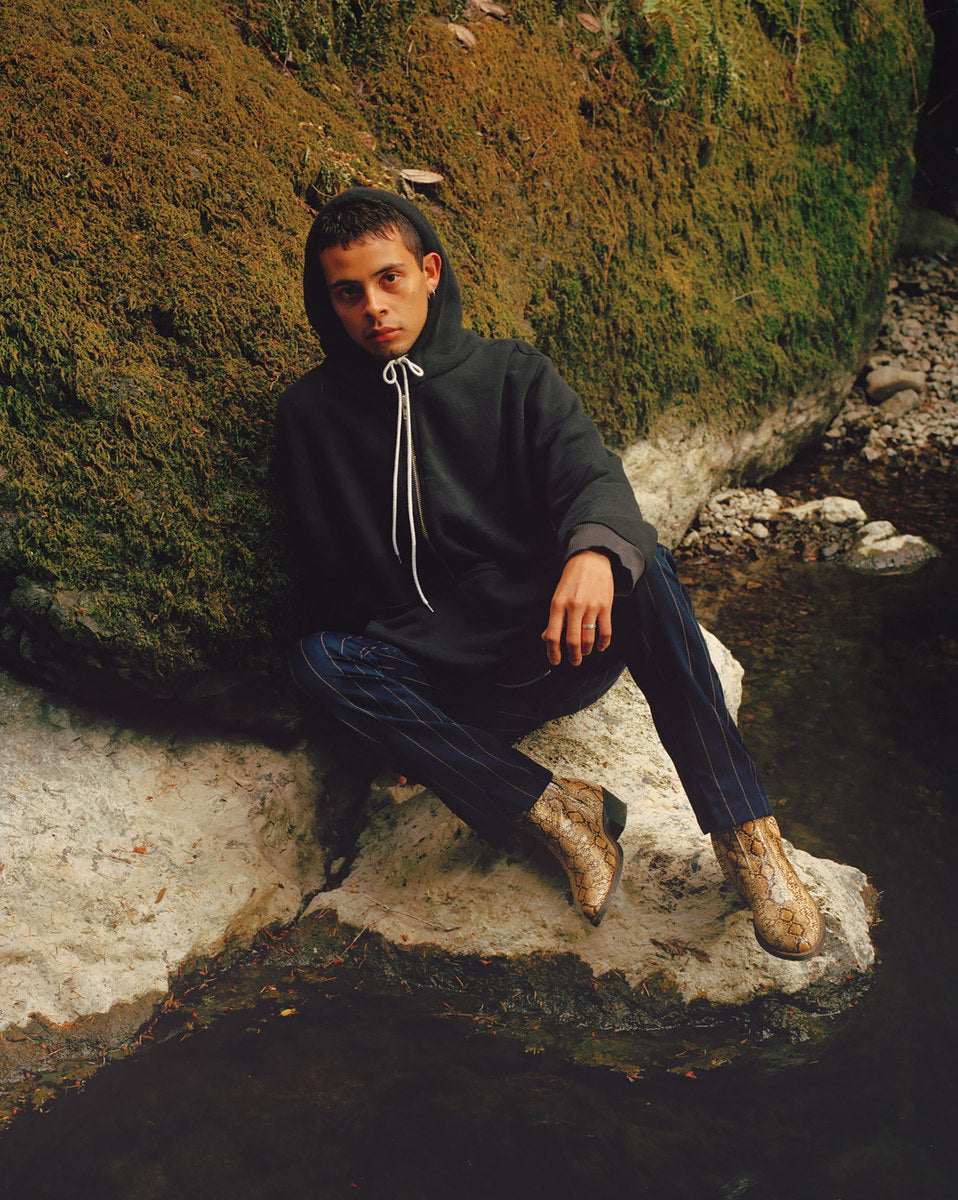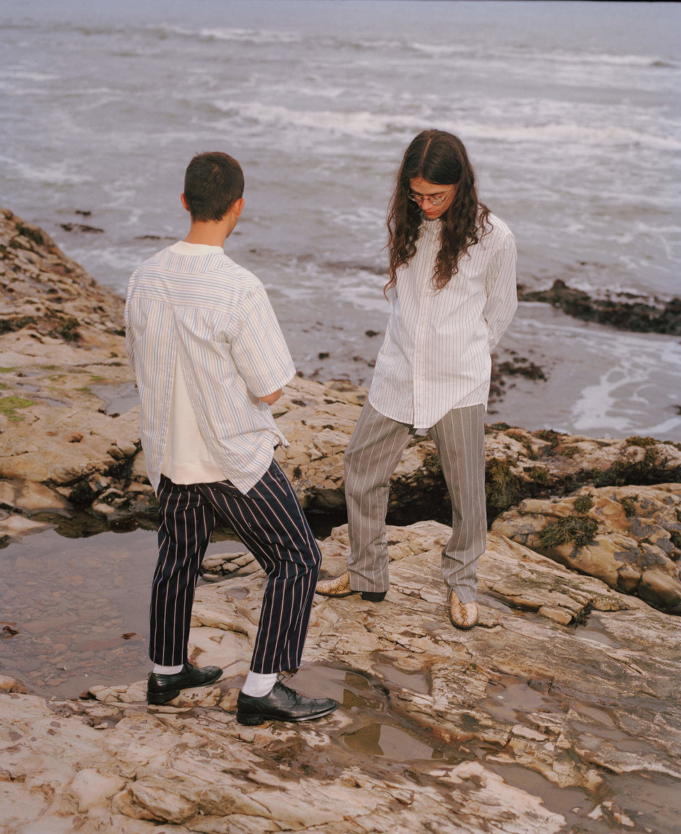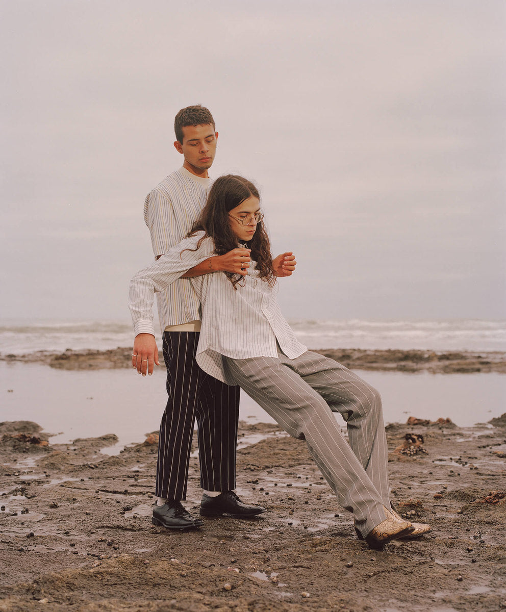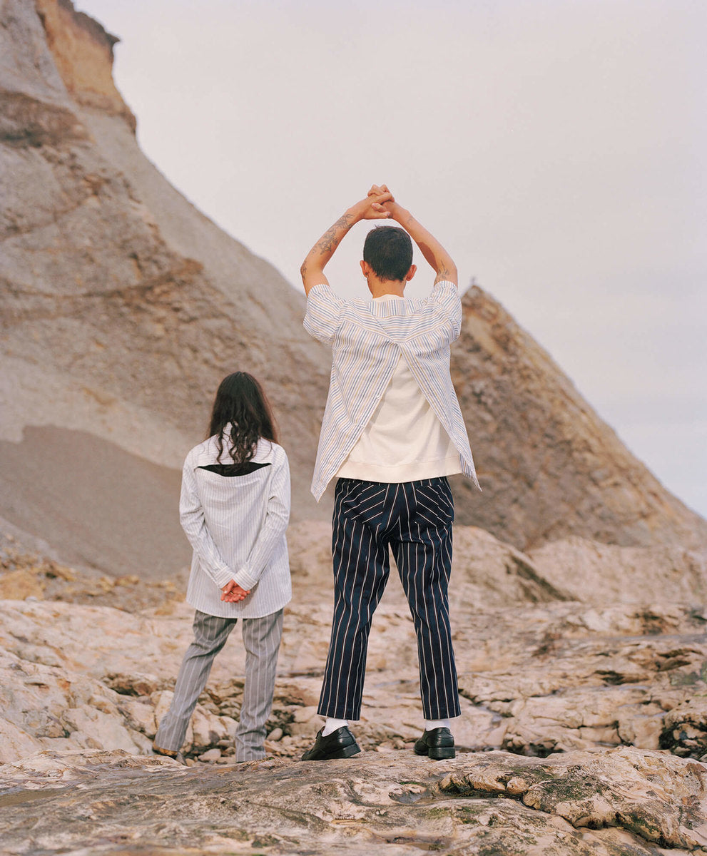 The fall winter 2018 collection was inspired by the idea of secret societies and the aesthetics and sounds that come from that world. Details include music references like enlarged polo-shirt buttons fashioned like vinyl records, speakeasy-style pinstripes, and hidden detailing like embedded waistband lace loops or invisible zippers. A few of the styles feature constructions that encourage the individual to wear pieces variably.