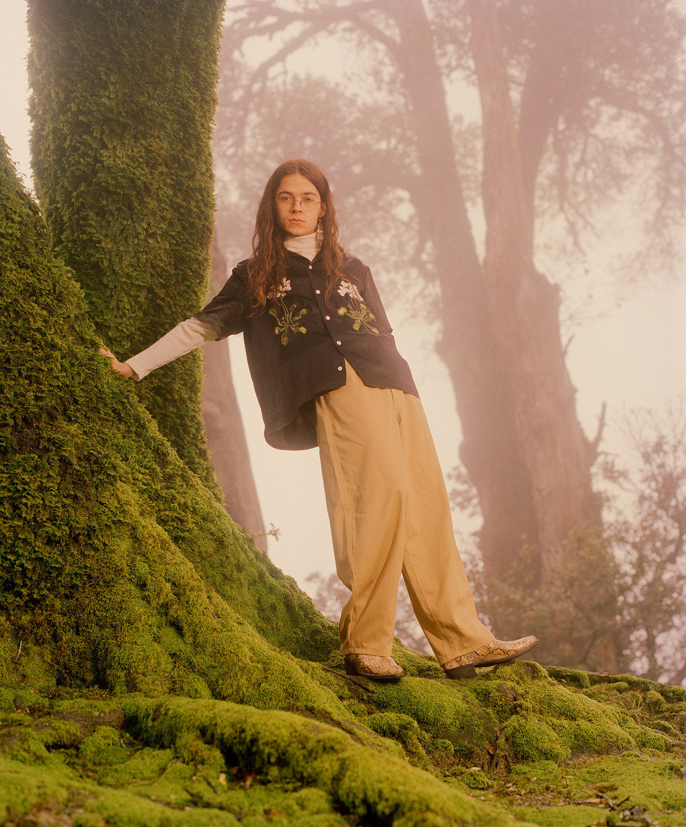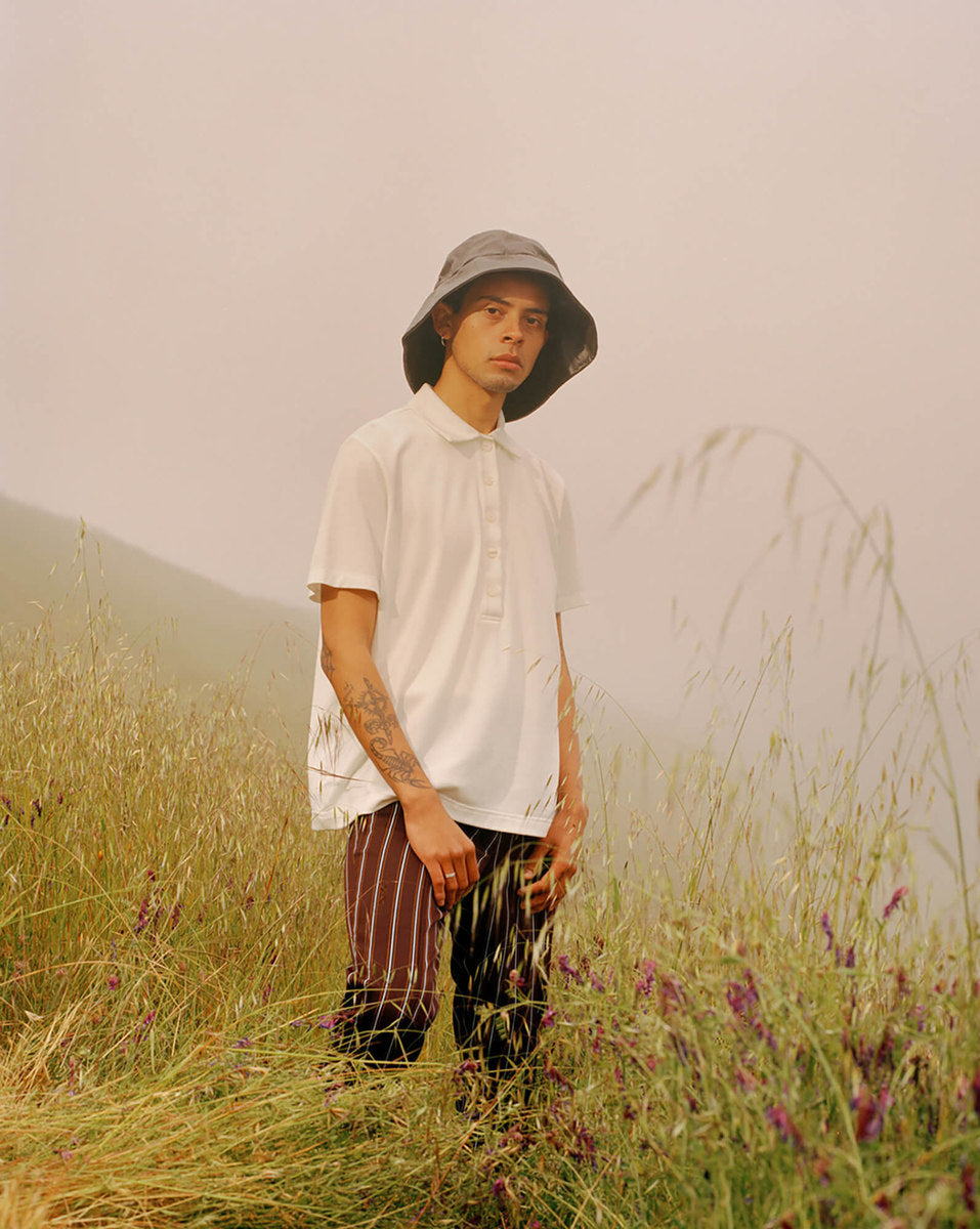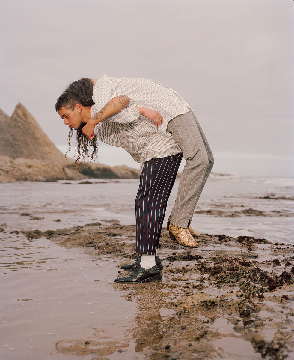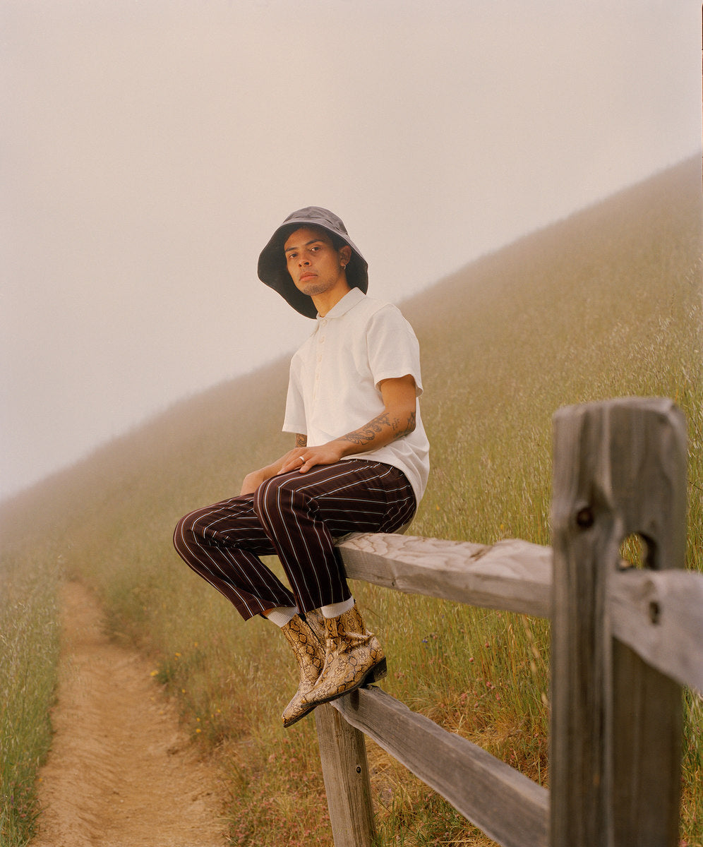 The fall winter 2018 collection was inspired by the idea of secret societies and the aesthetics and sounds that come from that world. Details include music references like enlarged polo-shirt buttons fashioned like vinyl records, speakeasy-style pinstripes, and hidden detailing like embedded waistband lace loops or invisible zippers. A few of the styles feature constructions that encourage the individual to wear pieces variably.