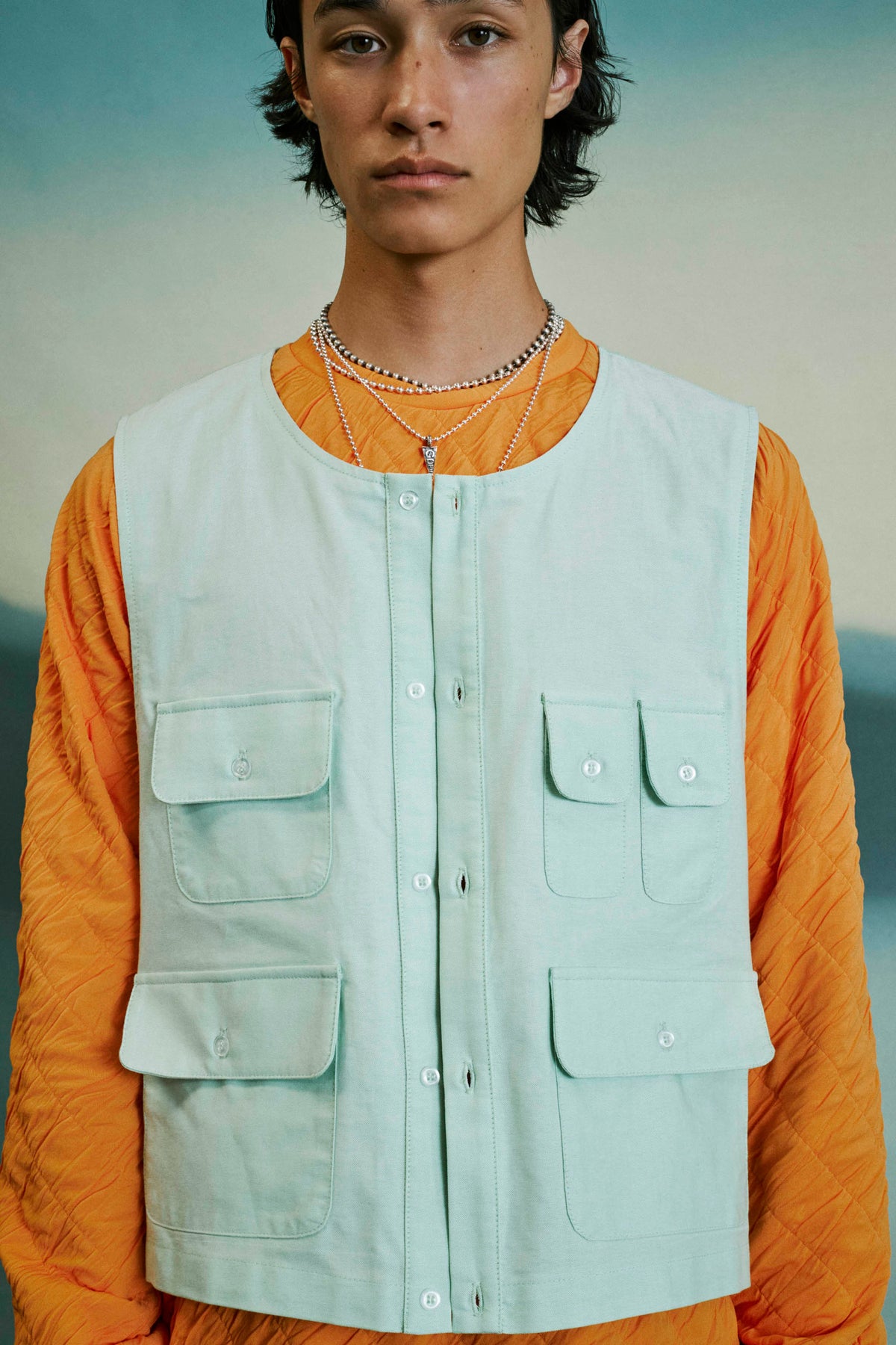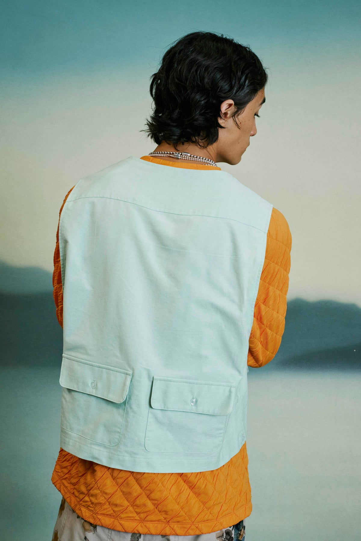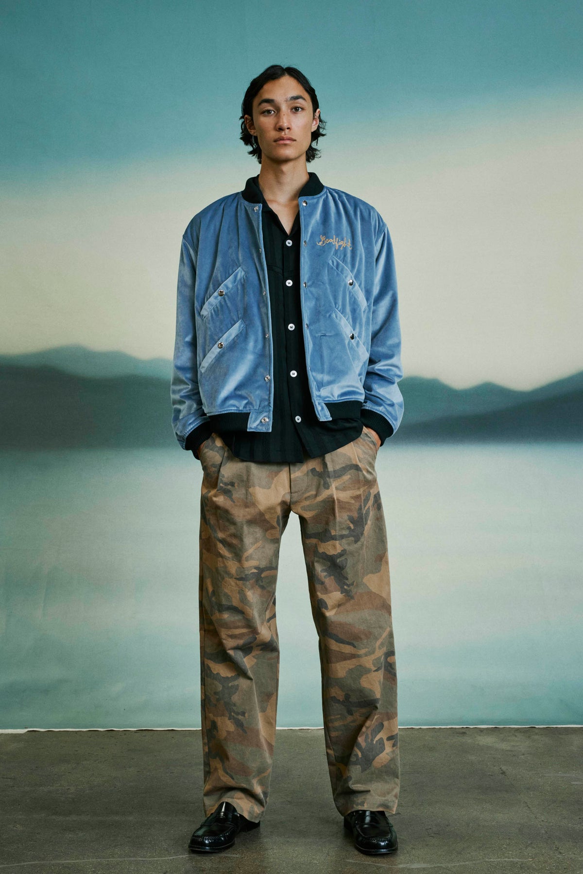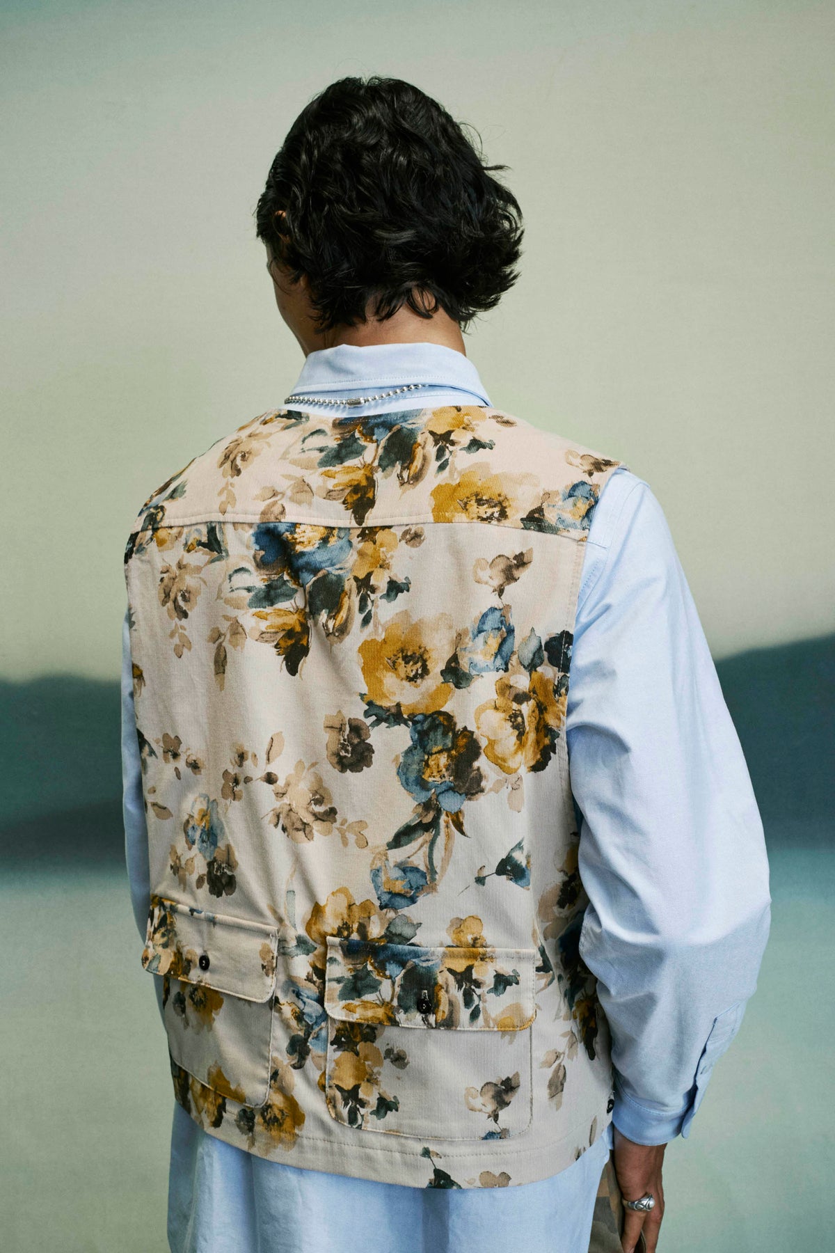 Our fisher wears specific clothing for function, and other garments for special personal meaning. The High Pressure Hood is cut in high density UPF fabric, a familiar garment used in the sport to protect wearers from UV-rays constantly reflected off water. Jackets are cut in floral watercolor corduroy and English plaid as a nod towards the flourish seen in sporting gear from a bygone era. Jersey has undergone rigorous wash & design to create a beautiful fade that traditionally comes from years of loving wear and daily bleaching from the sun. Pants feature technical detailing for equipment storage and durability. Multi-pocket vests actually fit professional fishing gear and can be worn tonally or in contrast with tops & outerwear. Artwork is a mix between romantic elements like handcraft chainstitch and modern graphic art that emphatically displays real fabric technology incorporated into the garment.