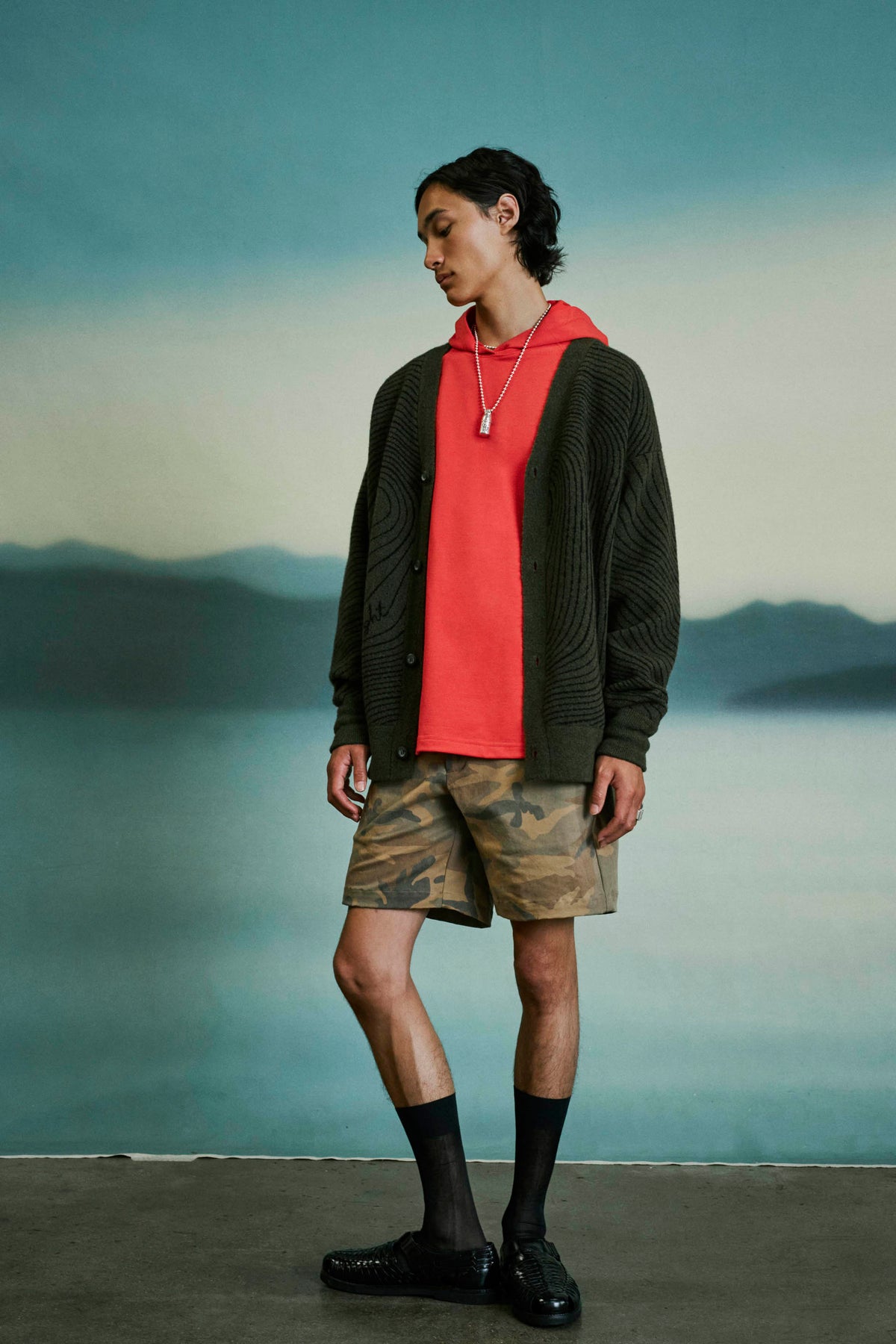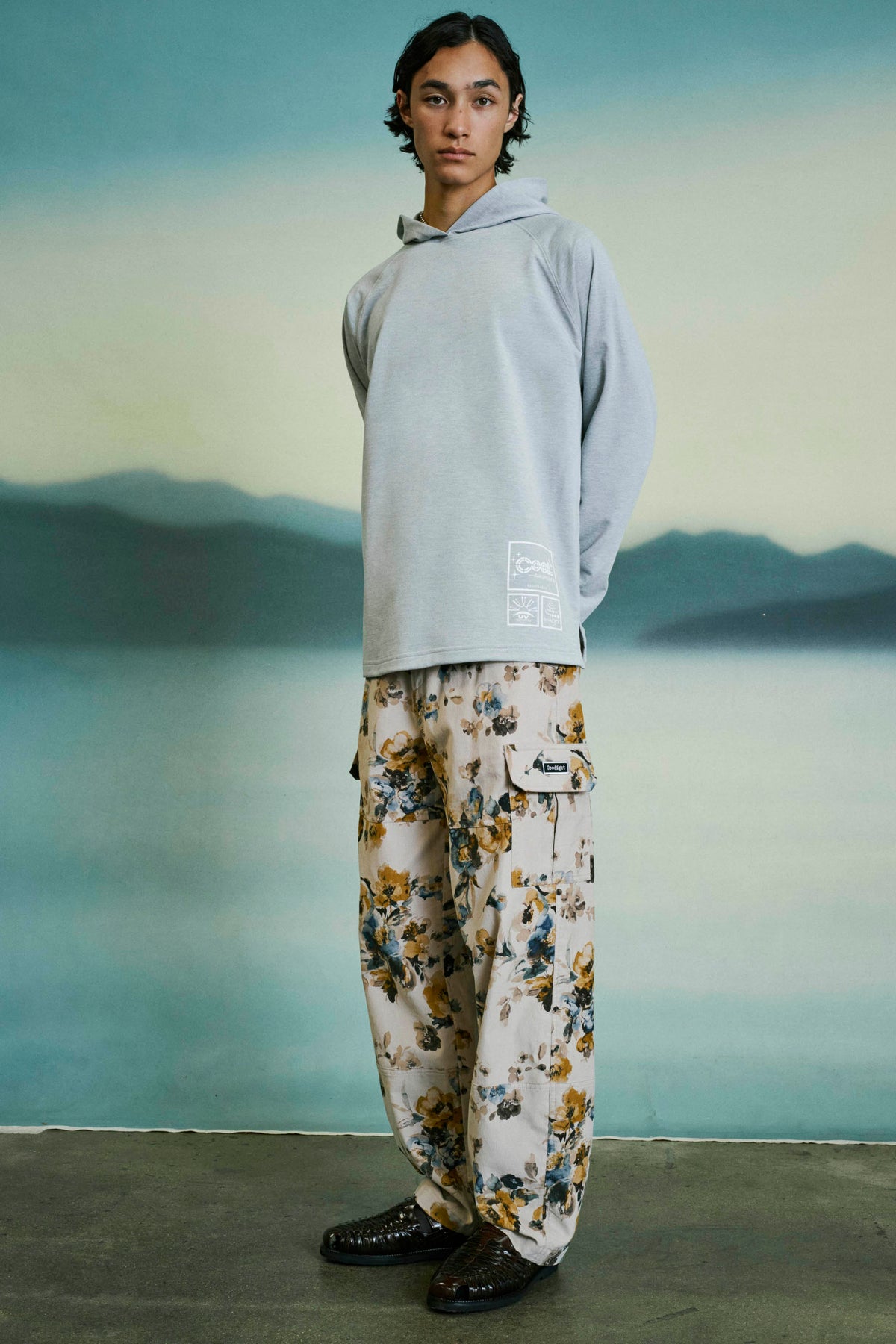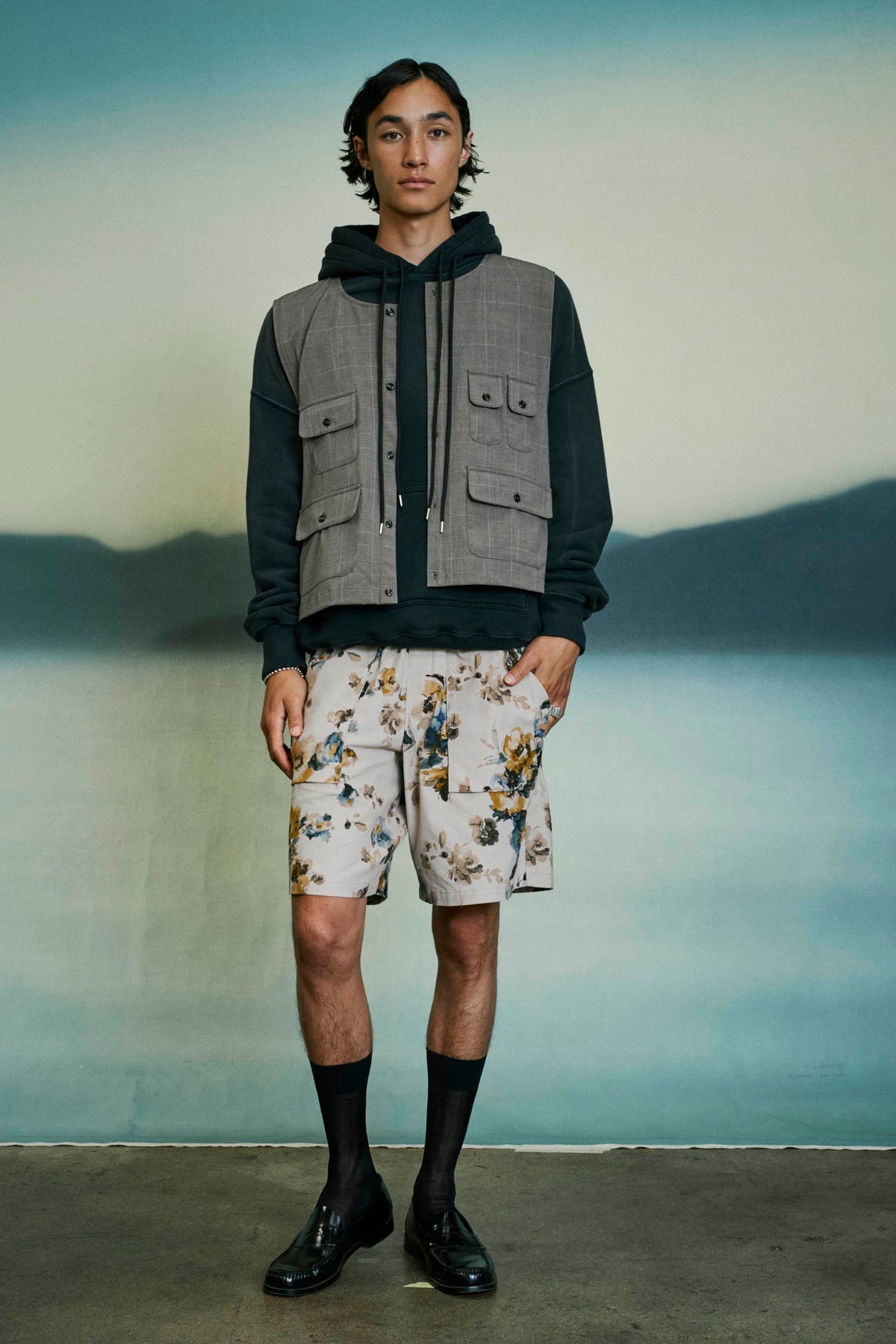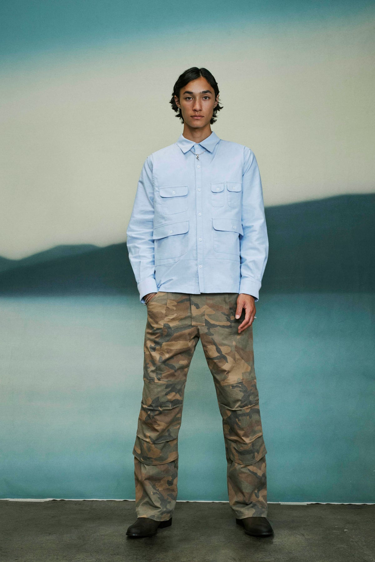 Our fisher wears specific clothing for function, and other garments for special personal meaning. The High Pressure Hood is cut in high density UPF fabric, a familiar garment used in the sport to protect wearers from UV-rays constantly reflected off water. Jackets are cut in floral watercolor corduroy and English plaid as a nod towards the flourish seen in sporting gear from a bygone era. Jersey has undergone rigorous wash & design to create a beautiful fade that traditionally comes from years of loving wear and daily bleaching from the sun. Pants feature technical detailing for equipment storage and durability. Multi-pocket vests actually fit professional fishing gear and can be worn tonally or in contrast with tops & outerwear. Artwork is a mix between romantic elements like handcraft chainstitch and modern graphic art that emphatically displays real fabric technology incorporated into the garment.