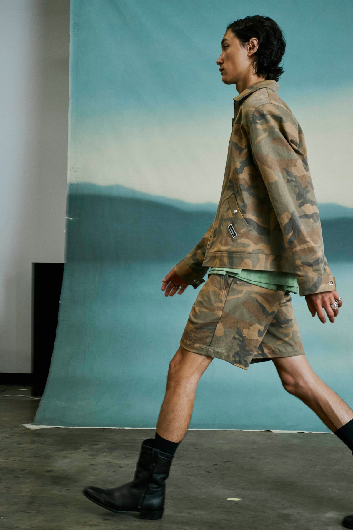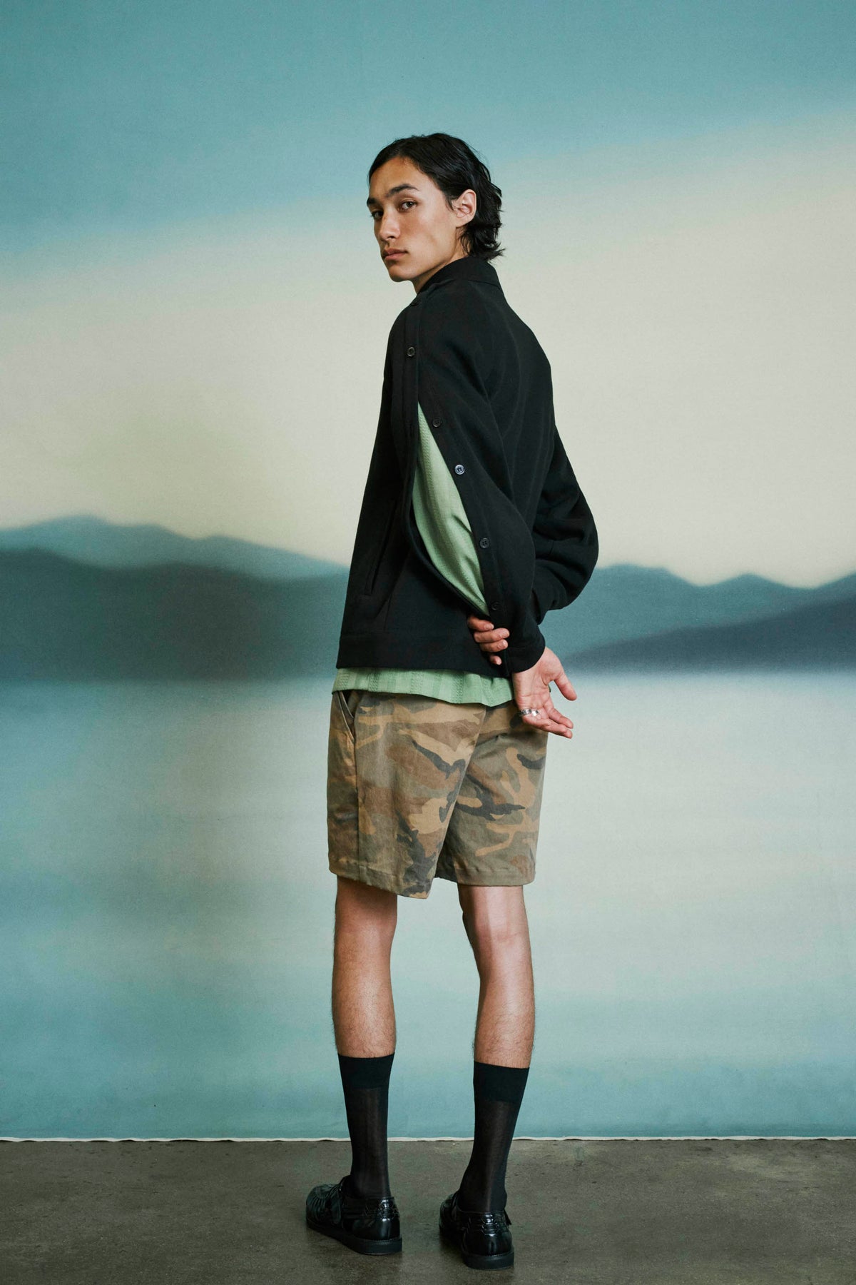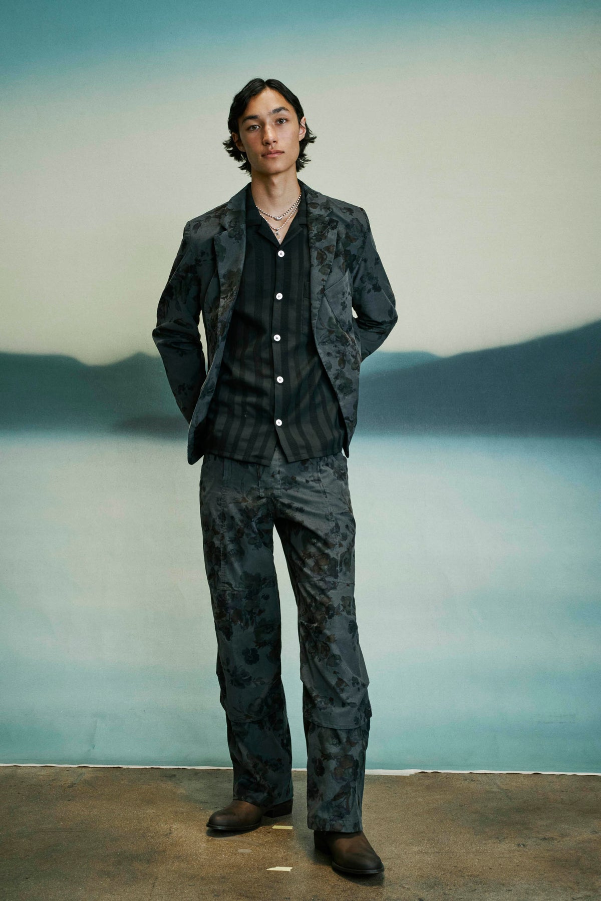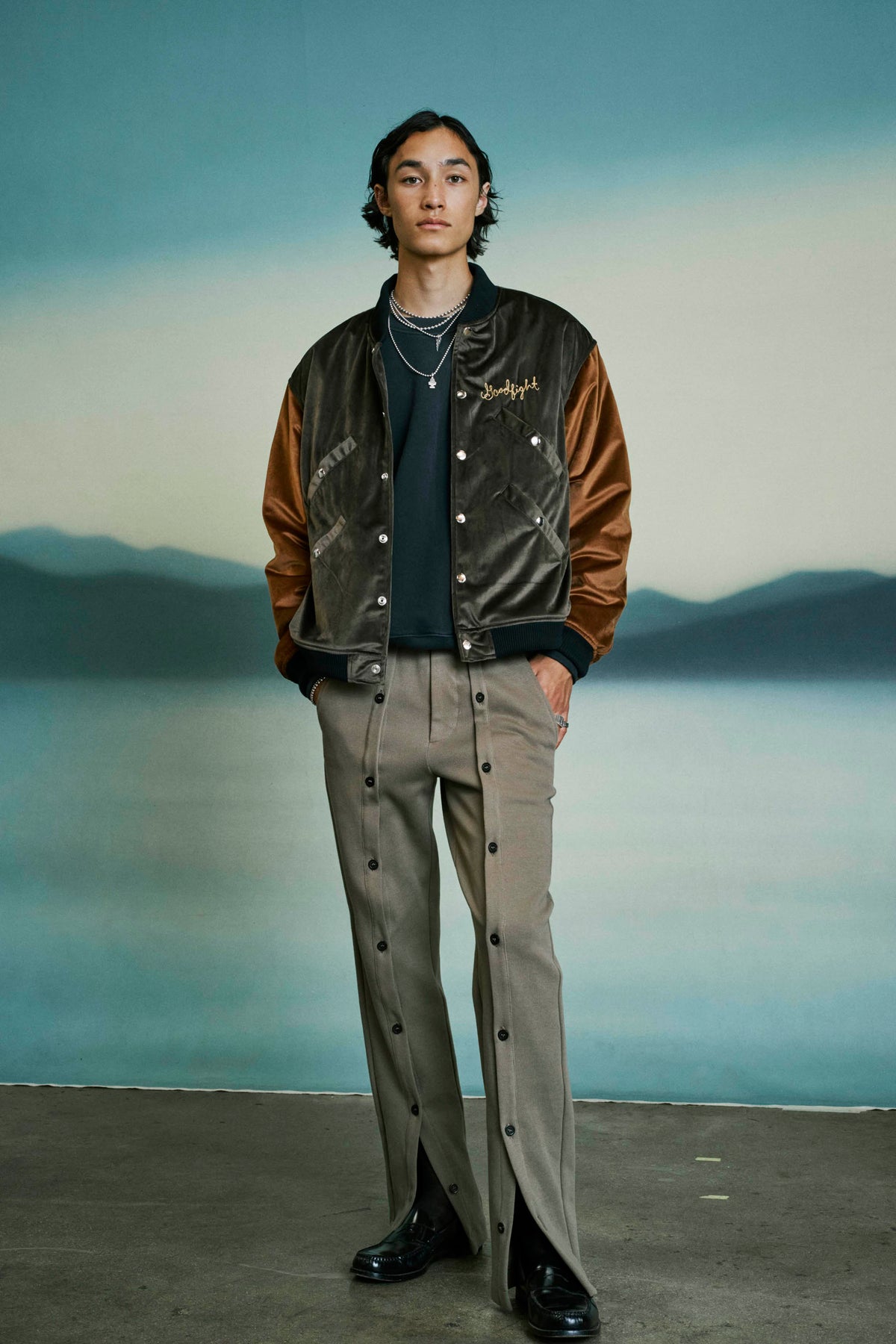 Our fisher wears specific clothing for function, and other garments for special personal meaning. The High Pressure Hood is cut in high density UPF fabric, a familiar garment used in the sport to protect wearers from UV-rays constantly reflected off water. Jackets are cut in floral watercolor corduroy and English plaid as a nod towards the flourish seen in sporting gear from a bygone era. Jersey has undergone rigorous wash & design to create a beautiful fade that traditionally comes from years of loving wear and daily bleaching from the sun. Pants feature technical detailing for equipment storage and durability. Multi-pocket vests actually fit professional fishing gear and can be worn tonally or in contrast with tops & outerwear. Artwork is a mix between romantic elements like handcraft chainstitch and modern graphic art that emphatically displays real fabric technology incorporated into the garment.