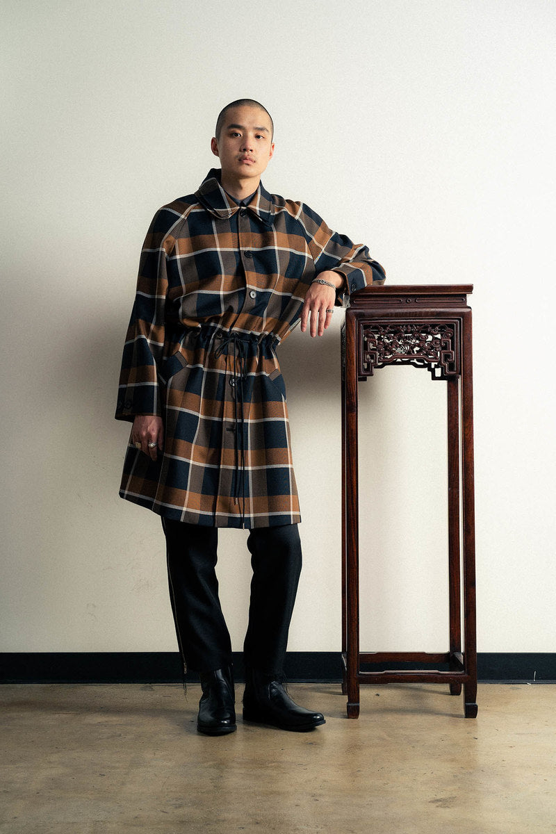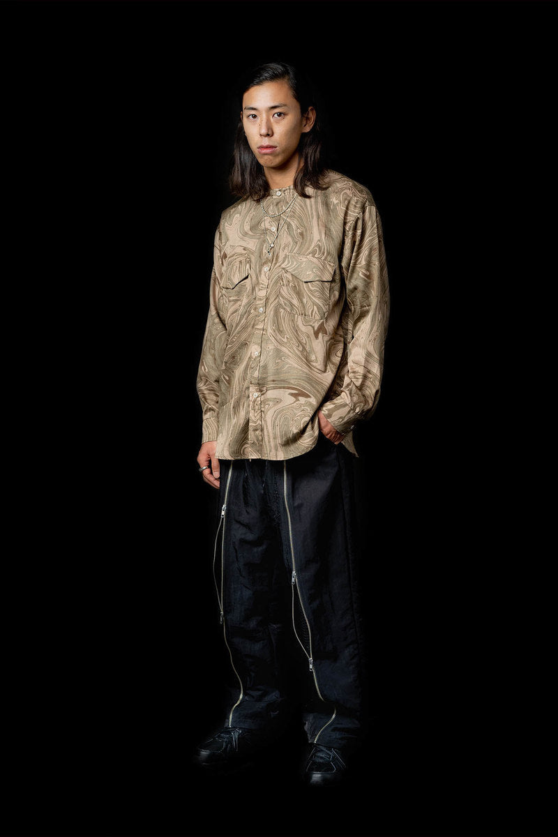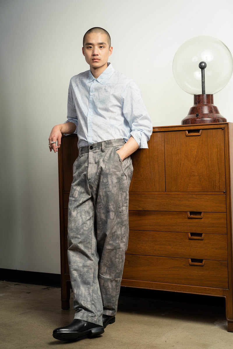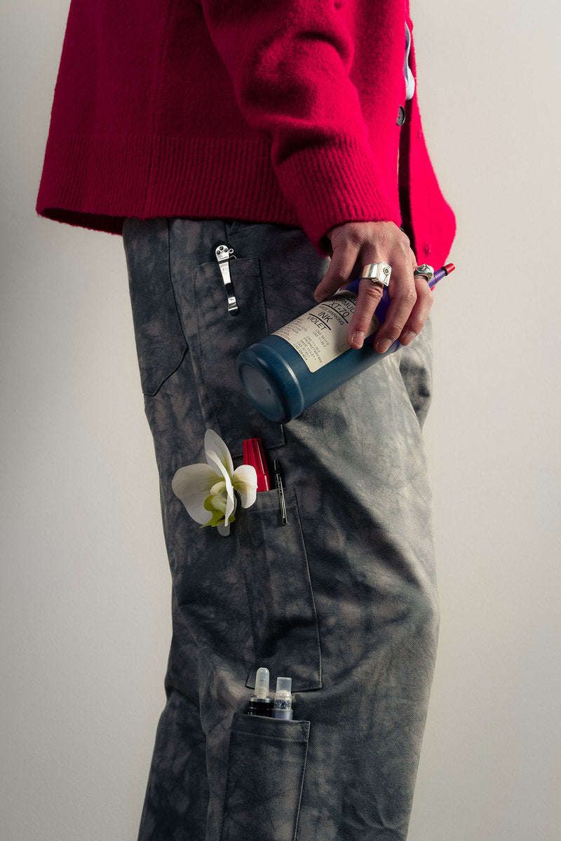 The Fall Winter 2021 collection explores the complicated nature of graffiti as a form of communication, as an existential marker, and as an agent of dissent. Some garments are crafted with functionality as the driving motivation, while others grapple with art itself. Pockets are fashioned externally or internally to stash cans, markers, or tools. Fabrics were often times sourced to deal with a single idea in two different ways—eg. a heavyweight poly-satin was chosen for its natural crinkle texture while a crinkle print fabric was used on shirting in a visually similar but physically different way. Details like these allow for tonal configurations of not only color, but texture.